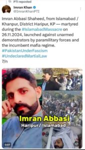 مقتول کا بھائی محمد ظہور عباسی، سیاسی وابستگی کو استعمال کرتے ہوئے، اپنے بھائی کی موت کو ریاستی اداروں کی کارروائی قرار دینے لگا۔ عمران عباسی کا نام 26 نومبر کے بلیو ایریا احتجاج میں فائرنگ کے ہلاک شدگان کی فہرست میں شامل کرا دیا گیا۔نتیجتا خیبرپختونخوا حکومت کی جانب سے 12 ورکرز کی "شہدا” لسٹ میں عمران عباسی کی تصویر اور نام شامل کر دیے گئے۔اسی بنیاد پر 14 دسمبر 2024 کو، اپوزیشن لیڈر عمر ایوب خان اور صوبائی وزیر بلدیات ارشد ایوب خان نے ایک تقریب میں محمد ظہور عباسی کے گھر ایک کروڑ روپے کا چیک پیش کیا۔ یہ رقم خیبرپختونخوا حکومت کی جانب سے "شہدا پیکج” کے تحت دی گئی تھی۔حقیقت مگر یہ تھی کہ عمران عباسی کی موت احتجاجی سرگرمی یا ریاستی کارروائی کا نتیجہ نہیں تھی، بلکہ ایک عام جرم یعنی موبائل چھیننے کی واردات میں ہوئی تھی۔