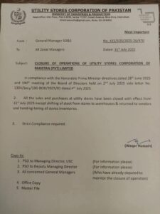 اسلام آباد:(وحید عباسی ) وفاقی حکومت نے ملک بھر کے تمام یوٹیلیٹی اسٹورز کو بند کرنے کا باضابطہ نوٹیفکیشن جاری کر دیا ہے۔ 31 جولائی 2025 سے ان اسٹورز پر ہر قسم کی خرید و فروخت بند کر دی گئی ہے، تاہم اسٹورز سے گوداموں میں موجودہ اسٹاک کی منتقلی، دکانداروں کو اشیاء کی واپسی اور اسٹورز کی انوینٹری کا حوالگی عمل تاحال جاری رہے گا۔