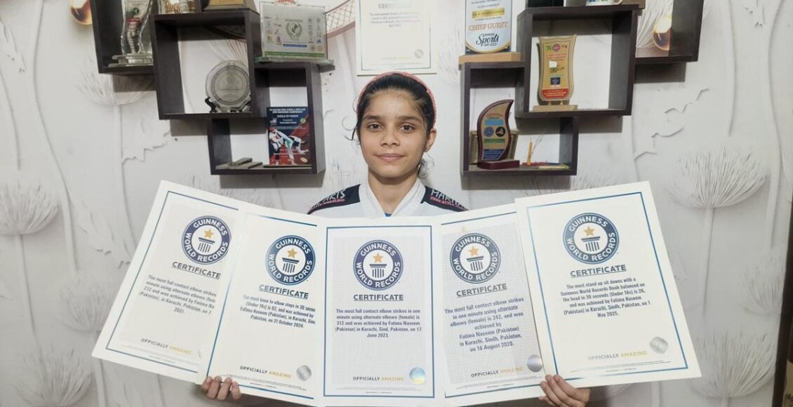 اسلام آباد (رپورٹ: سید محمد یاسین ہاشمی) — پاکستان کی کم عمر مگر بلند حوصلہ بیٹی، 11 سالہ فاطمہ نسیم نے ایک اور شاندار عالمی ریکارڈ اپنے نام کر کے پاکستان کو فخر کا موقع دے دیا۔ فاطمہ نے گنیز بک آف ورلڈ ریکارڈ میں انوکھا ریکارڈ قائم کرتے ہوئے دونوں ہاتھوں میں انڈا پکڑ کر ایک منٹ میں 302 فل ایکسٹینشن پنچز مار کر نیا عالمی ریکارڈ قائم کیا، جس کی باضابطہ تصدیق گنیز ورلڈ ریکارڈز نے کر دی ہے۔