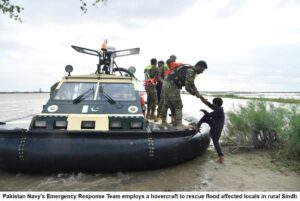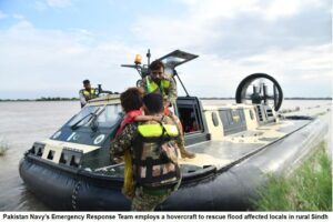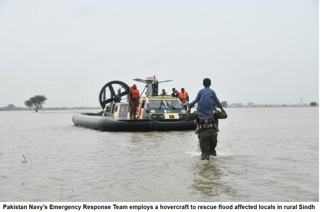 سندھ میں کشمور، گھوٹکی، سکھر اور شکارپور کے اضلاع میں سیلاب میں گھرے افراد کے انخلاء کے لیے پاک بحریہ ہوور کرافٹس استعمال کر رہی ہے۔ یہ ہوور کرافٹس زمین،پانی اور دلدلی علاقوں میں آپریشن کی صلاحیت رکھتے ہیں ۔ سندھ کے ان اضلاع میں اب تک 4335 افراد اور 125 سے زائد مویشیوں کو محفوظ مقامات پر منتقل کیا جا چکا ہے۔