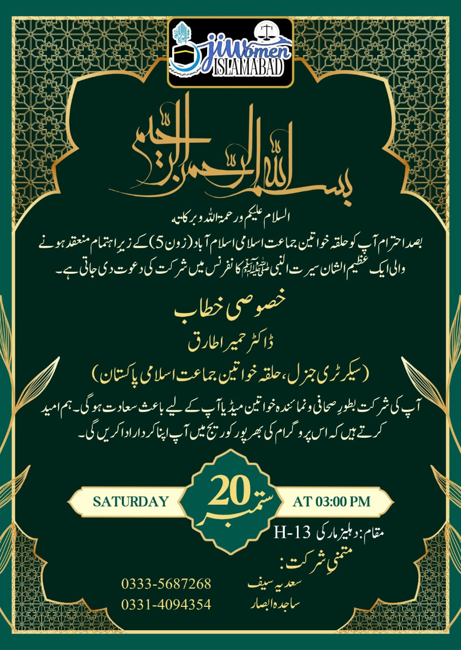 اسلام آباد : حلقہ خواتین جماعت اسلامی اسلام آباد (زون 5) کے زیر اہتمام ایک عظیم الشان سیرت النبی ﷺ کانفرنس 20 ستمبر بروز ہفتہ شام 3 تا 5:30 دہلیز مارکی H-13 میں منعقد ہوگی۔