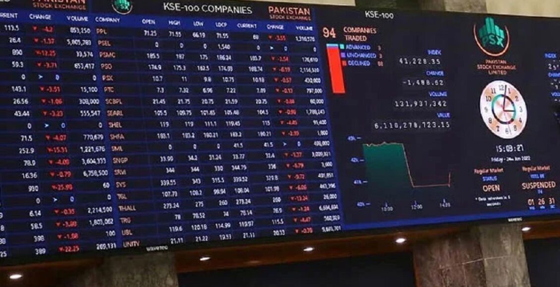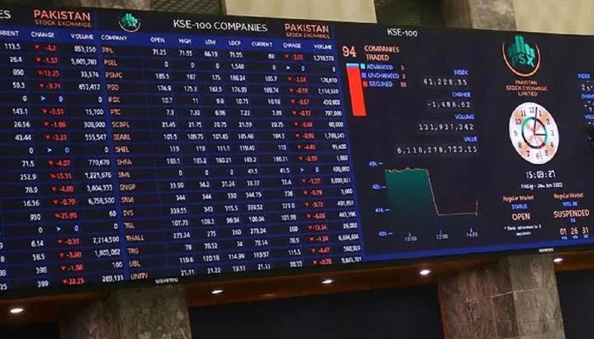 پیر کو کاروباری ہفتے کے پہلے روز پاکستان اسٹاک ایکسچینج میں زبردست تیزی دیکھی گئی اور 100 انڈیکس ایک لاکھ 63 ہزار 903 کی نئی بلند ترین سطح پر پہنچا تاہم کاروبار کے اختتام پر پوائنٹس میں کچھ کمی ہوئی اور انڈیکس ایک لاکھ 63 ہزار 847 کی سطح پر بند ہوا۔